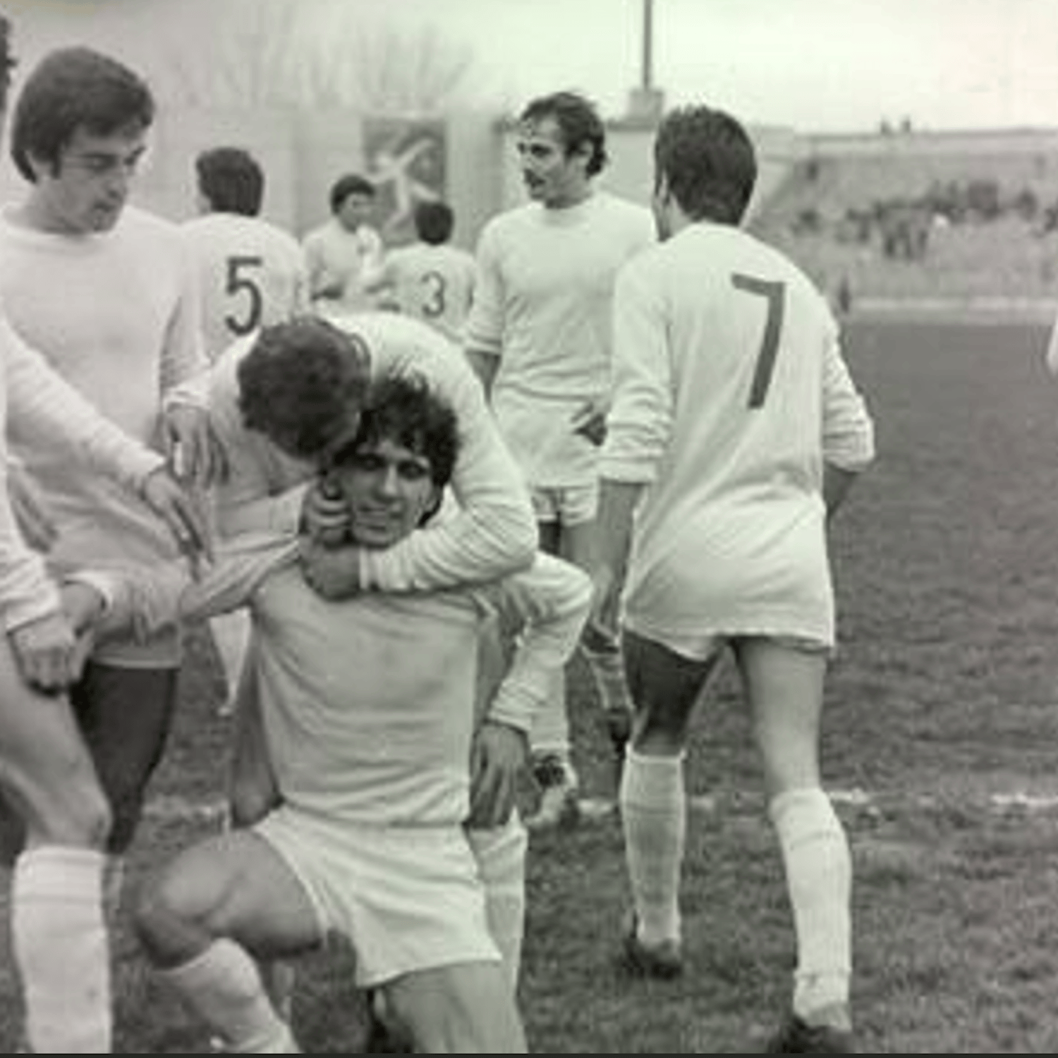 Gheorghe Hagi, felicitat de jucătorii Constantin Gache și Ion Constantinescu într-o nouă partidă în care a adus victoria Farului (sezonul 1982-1983)