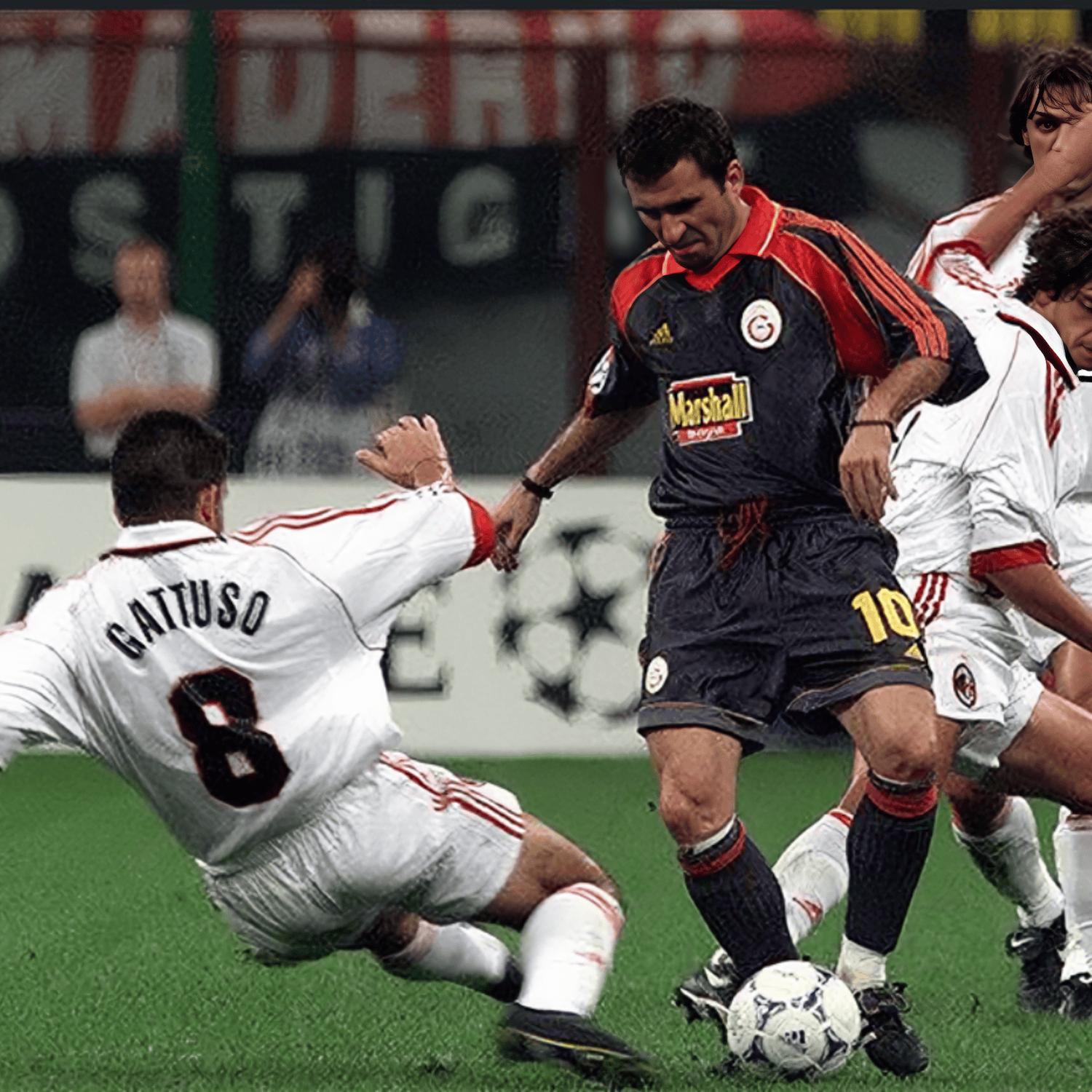 Gheorghe Hagi în AC Milan - Galatasaray 2-1 (21.09.1999, în Grupa H, Liga Campionilor) - între trei jucători ai Milanului (Gattuso, Albertini și Maldini)