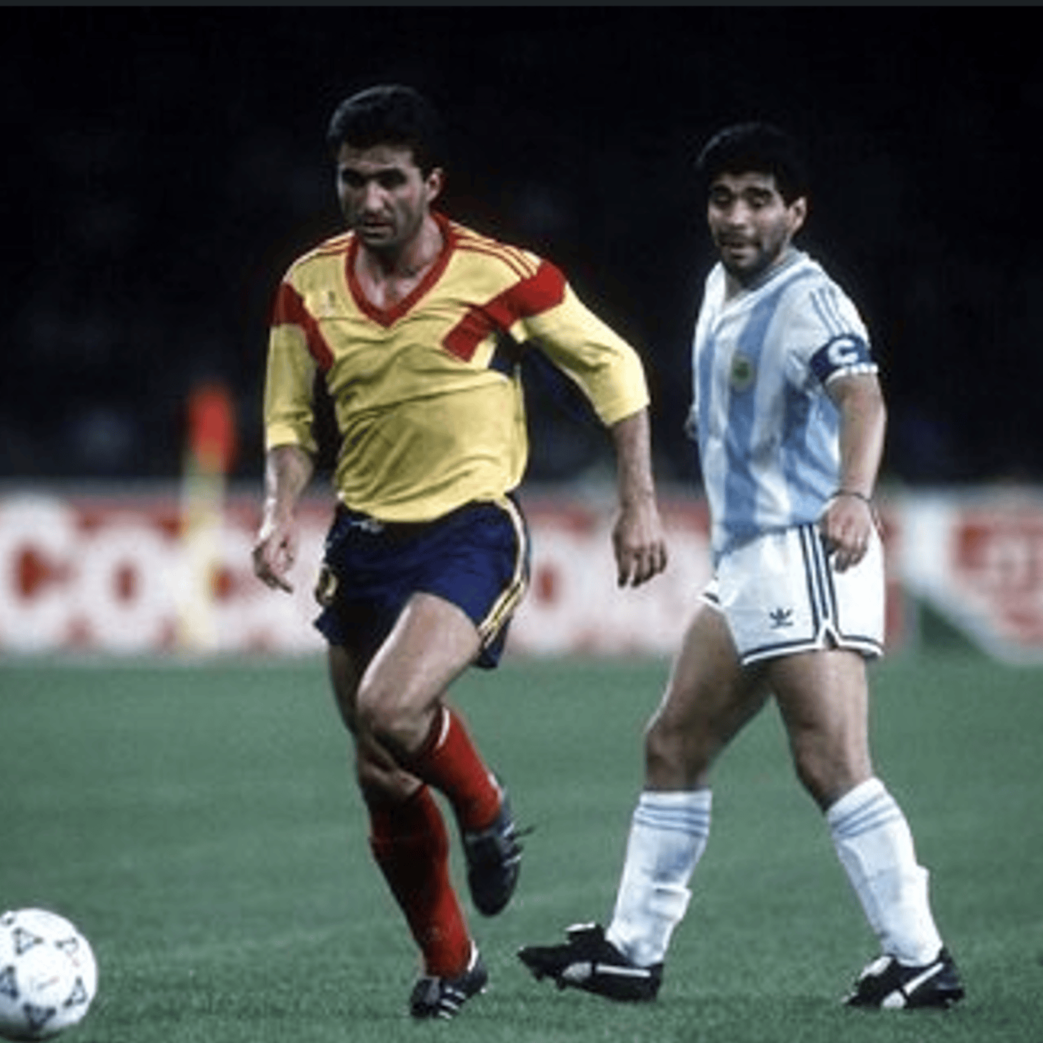 Gheorghe Hagi si Diego Maradona în meciul Romania - Argentina 1-1 (18.06.1990, C.M din Italia, Grupa B) - singurul meci în care cei doi s-au întâlnit